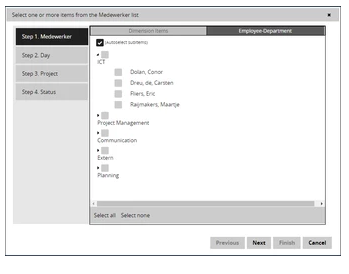 When a view that contains a flexible report is opened, then first a selection wizard is opened. In the selection wizard a preselection can be made on one or more dimensions before they are shown in the view. For example, there is the possibility to select certain months, weeks or days within a year, or selecting a specific department within an organization.