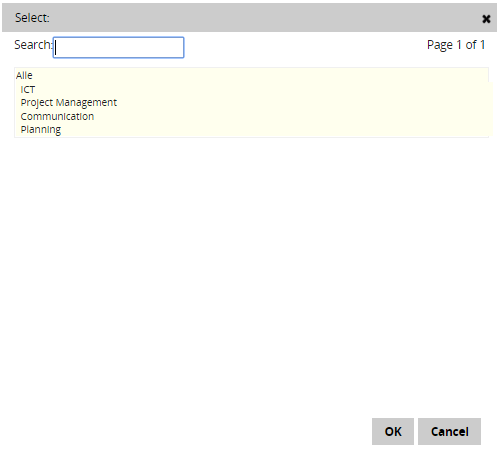 In the second case, this means that the information displayed depends on the selected cell value. When clicking on the 'choose value variable' button, values can be chosen by selecting the relevant value in the displayed selection list, or the preferred value can be searched using the search bar (see figure below).