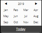 . Subsequently all months of the current year will be shown. When this bar is clicked again, an overview of 12 consecutive years is shown.When the year and month are selected, a week can be selected by clicking on the relevant week number, a day can be selected by clicking on the relevant date. It may be that there is already a pre-selection on the selectable data. The image below is an example where only the months of a year can be selected.