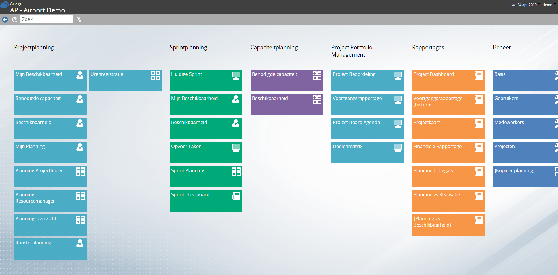 Het Applicatie Menu is het hoofdscherm binnen de applicatie, waarin de gebruiker de mogelijkheid heeft om schermen en rapporten te openen. De gebruiker ziet enkel de onderdelen van het proces waartoe deze is geautoriseerd. Wanneer er op een proces onderdeel wordt geklikt, opent een nieuw scherm. Wanneer er een onderdeel wordt geopend van het type rapportage (Gebruikers of Gedeelde Rapportages), wordt het desbetreffende rapportage geopend.
