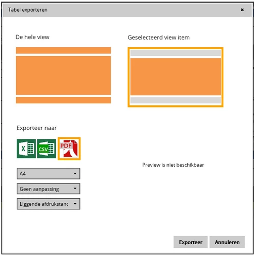 Rechts in het dialoog venster is er, wanneer mogelijk, een voorbeeld te zien van de te exporteren pagina. Wanneer de gewenste opties zijn geselecteerd kan er op de knop 'Exporteer' of 'Annuleren' gedrukt worden.